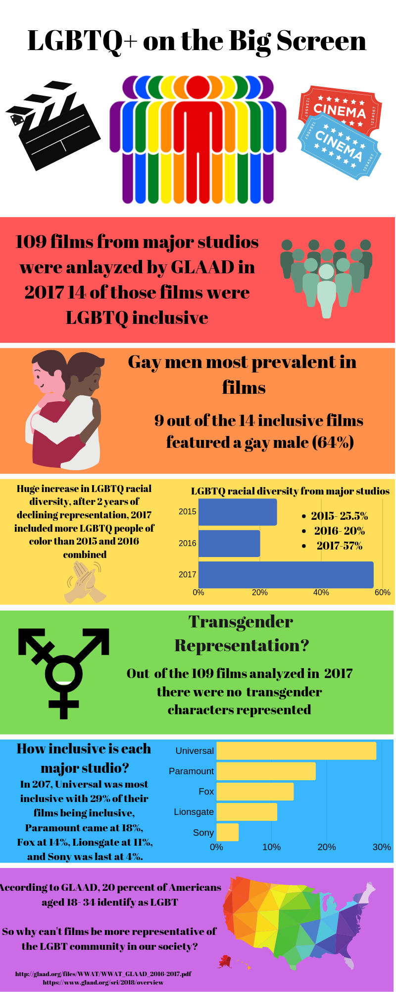 For my DIY I wanted to focus my idea around the representation of the LGBTQ community within the film industry. Luckily, within recent years, the representation of the LGBTQ community has begun to increase and become more prevalent within the film industry as a whole. However, there is still an under representation as a whole. Within my infographic you will be able to see the inclusion of these characters; as many large film companies have included more of the LGBTQ community in their box office hits. As expected and found throughout films, and even other media services like broadcast tv and streaming, there is a high representation of gay men specifically. Nonetheless, in total there was an an increase in the representation of the LGBTQ community, with a total of 109 films that were released 14 of them (12.8%) includes the LGBTQ community. In addition when talking about ethnicity and the diversity of the LGBTQ community, there was finally an increase in ethnic diversity from the previous two years. In total 57 percent of the characters in these films were people of color, while the previous two years showed a representation of 20 percent in 2016, and 25.5 percent in 2016. Hence, in terms of ethnic representation there seems to be a drastic increase from previous years. In addition, movie companies as a whole have all tried to welcome more LGBTQ characters into their firms. For instance, Universal is by the far the most inclusive company which had a total of 14 films the past year; four of those films where LGBTQ inclusive. On the other hand, other major music companies like Paramount released 11 films, and two of those were LGBTQ inclusive. Fox produced 14 films the past year, and two of those included the LGBTQ community. Disney was on the lower end of LGBTQ inclusivity, with only one out of the eight films which showcased a gay character. Sony however was on the lower end and only represented one LGBTQ character out of the 25 films that were released, which is only four percent. What I find really interesting is that there is such an underrepresentation of the LGBT community. According to the 2018 GlAAD report, in the United States 20 percent of people between the ages of 18-34 identify as being gay. Now when we compare this number to the data that I have quickly recapped, it becomes evident that there is a discrepancy in the representation of the LGBT community on the big screen. Therefore, my infographic highlights these inconsistencies, in hopes that major film studios will add more LGBT characters to their films, and really level the playing field in terms of both diversifying and being more inclusive of the LGBT community. In addition, the LGBT community should be represented fairly, in term of positive and non degrading roles in which they translate well to the LGBT community in our society.